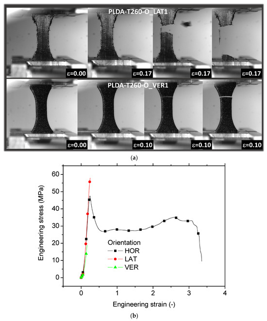 Effects of the part orientation on the tensile performance of 3D printed PLDA material for a fixed printing temperature of 260 °C. (a) Deformed samples for both vertical and lateral configurations under various load levels, (b) engineering tensile response of printed samples for all considered part orientations.