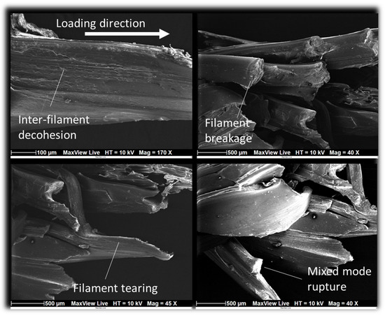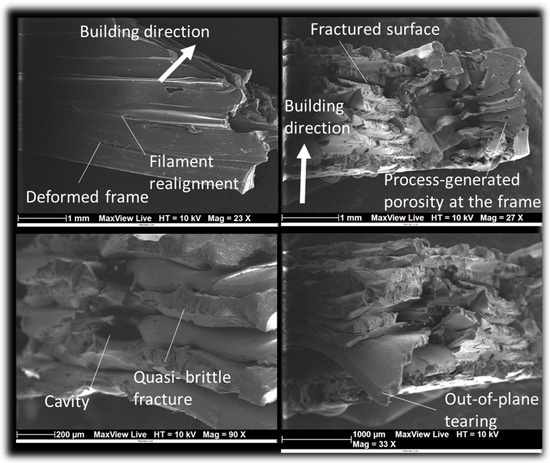 Figure 9 shows transverse and top views of the fractured surfaces. Filament realignment in the same direction of the external frame is highlighted by the micrograph on the top left. On the same micrograph, the large deformation of the filaments was responsible for the decohesion within the external frame, which was formed by two adjacent filaments. A transverse view of the fractured surface (micrograph on the top right) reveals the extent of the cracking along the longitudinal direction, which indicates the predominance of a mixed crack propagation mode combining the shear and crack opening. According to the same transverse view, the micrograph on the bottom left shows that the adjacent filament decohesion left a quasi-brittle fractured surface. Due to the way the filament was arranged throughout the thickness, these fragile surfaces became visible in every alternate pair of layers. Additionally, the significant tearing led to a deformation that occurred out of the plane, thereby contributing to the further propagation of the cracks in the longitudinal direction, as illustrated in the micrograph in the bottom right corner.