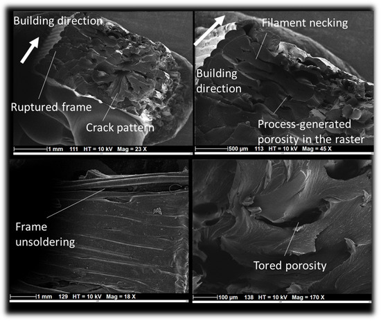 In order to provide further insight into the deformation mechanisms of 3D printed PLDA, imaging analysis is needed. At a low scale of approximately 1 µm, TEM (transmission electron microscopy) can provide information regarding fusion and structural mapping [32]. But, this method is more adequate for metallic-based materials obtained using AM, where a crystallographic arrangement at the atomic and nanometric scales can be significantly tuned through processing, such as processing of the columnal grain growth. In the case of polymeric materials, SEM analysis is more suitable, especially at the microstructural scale. This analysis was conducted for 3D printed PLDA, as shown in Figure 8. Among the identified modes of rupture, inter-filament decohesion was a common mode (micrograph on top left). It resulted from a lack of load transfer across the adjacent filaments. The large stretching of the filaments resulted in significant tearing of some filaments and the sudden breakage of others (micrographs on top right and bottom left). Depending on the loading and filament arrangements, mixed ruptures were observed more likely when transverse cracking of the filaments was combined with a large uniaxial extension (micrograph on bottom right).