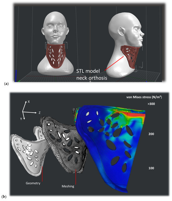 Figure 11a shows one particular style of neck orthosis called a rigid brace, which is used for more severe injuries. One of the main functions of this device is to help immobilize the neck, reducing movement and minimizing strain on injured or healing neck structures. The design is built by considering an airy structure to achieve a good compromise between material consumption and performance. Based on a structural analysis, finite element computation defines the strain field that matches realistic loading (Figure 11b). This analysis shows the development of a symmetrical stress field with two main regions of the stress concentration: close to the chin and chest support regions. This result reflects the stress field related to a transverse isotropic model with a longitudinal modulus (EL = 291 MPa) that is aligned with the z-direction, which is 1.18 times lower than the two moduli in the X and Y directions (ET = 343 MPa).