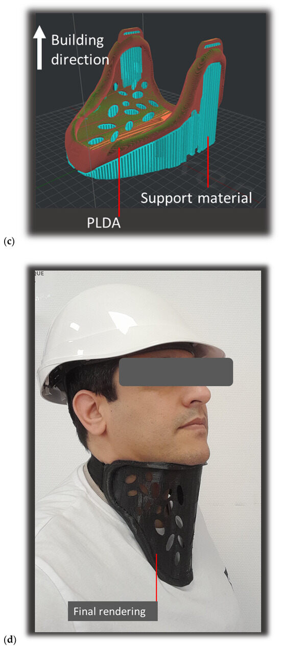 The design space corresponds to 142 × 162 × 117 mm3, and the optimized neck orthosis volume is 120 cm3, for which 163 g of PLDA is required for the printing stage. The part orientation was selected to guarantee the continuity of the filaments along the areas subject to significant tension and to minimize the printing duration. The slicing step creates overhangs in the model, and the complexity of the neck orthosis design induces some risks of sagging or misshaping without support material. Thus, a support of the same material is added, as shown in Figure 11c, anywhere there is a risk of structure collapse. The amount of support represents 9% of the total design weight. The same printing conditions shown in Table 1 are used for printing the design, with the exception of the printing temperature, which is fixed to 260 °C. Under these conditions, a duration of 13.5 h is needed to print the design. Figure 11d shows the final rendering of the neck orthosis based on the PLDA material. It can be upgraded by using foam or fabric on top of the rigid brace structure to add more soft support for comfort.