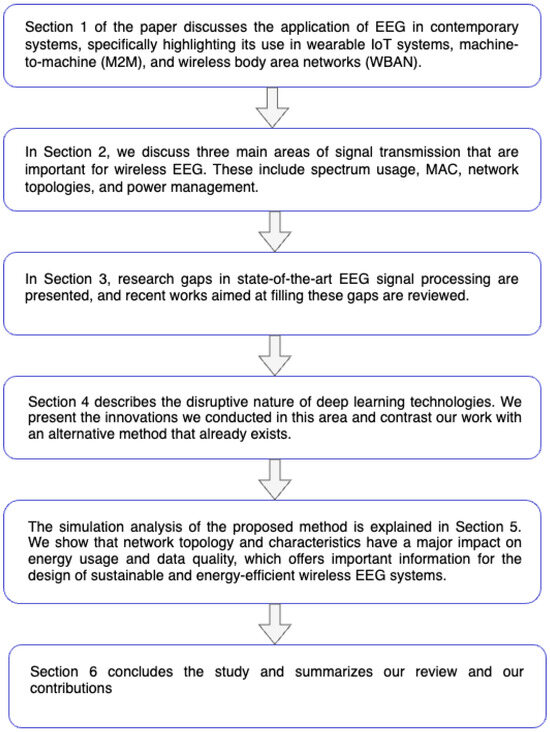 In summary, this study shifted the focus from the traditional Fourier domain analysis to a machine-learned feature extraction and reduction approach for EEG signals. This new methodology not only offers significant advancements in feature extraction and noise reduction but also presents a sustainable solution that aligns perfectly with the objectives of next-generation green wireless networks and industrial IoT. Next, we provide the roadmap for the paper to benefit the audience. We begin with a discussion of how EEG is used in modern systems, particularly in machine-to-machine (M2M) communications, wearable IoT systems, and wireless body area networks (WBANs). We detail how aspects such as heterogeneity, energy, and quality of service (QoS) play critical roles. This is followed by detailing the key aspects of signal communications related to wireless EEG, namely power management, MAC and network topologies, and spectrum usage. Next, we survey the research gaps in the current state-of-the-art of EEG signal processing and review recent works that aim to overcome these gaps in Section 3. The gaps consist of how to best collect the data for EEG applications via the channel selection nature of the application. This is followed by a study on the distributed collection and processing of signals captured at separate locations. Finally, Section 4 details how disruptive the technology is: Deep Learning. We demonstrate the novelty we carried out in this regard and compare the work to another existing approach. This is followed by the conclusion section, which summarizes our review and contributions to this paper. We demonstrate that network topology and parameters significantly influence not only data fidelity but also energy consumption, thus providing valuable insights into the development of wireless EEG systems that are sustainable and energy-efficient. Figure 1 shows the structure of the proposed work.