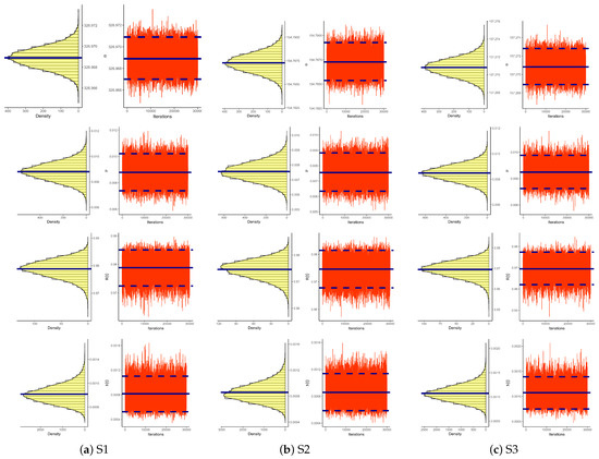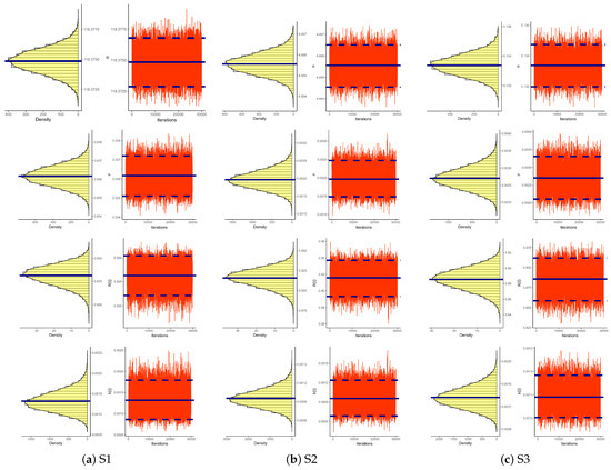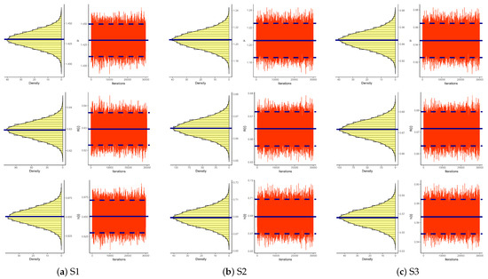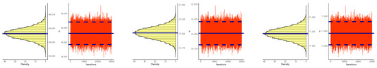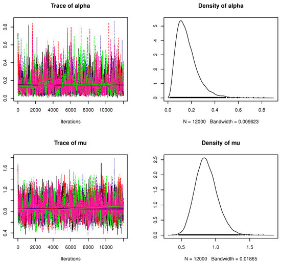 Figure 9 depicts both the density and trace plots of the various parameters from each dataset presented in Table 2 to emphasize the convergence of MCMC runs. The solid line shows the Bayesian point estimate for discrimination, whereas the dotted line indicates the 95% HPD interval boundaries. The MCMC technique converges in a good way, as shown in Figure 9, and the recommended size of the burn-in sample is suitable to avoid the consequences of any suggested initial values. Furthermore, it demonstrates that the derived estimates of and tend to be symmetrical, whereas those of and are negatively and positively skewed, respectively.