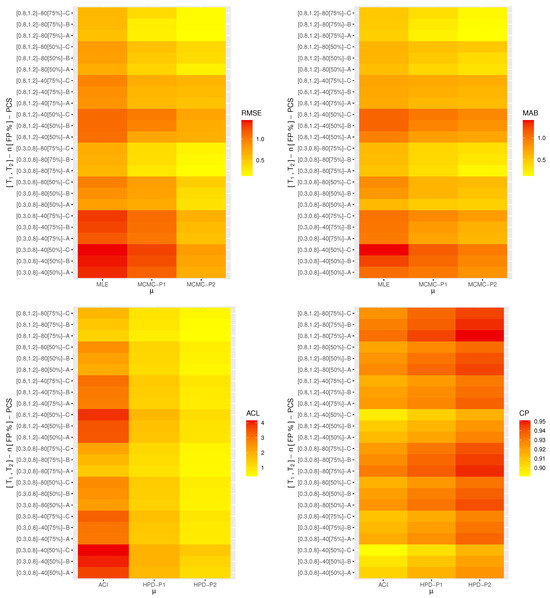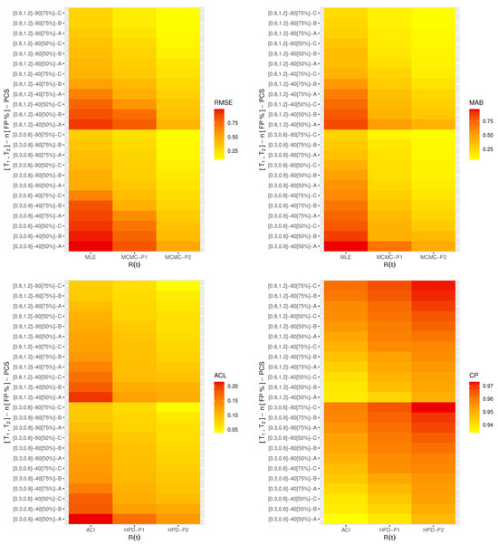 Another essential aspect to investigate is the construction of the ACIs for RF and HR. The challenge now is obtaining the variances of and if we know the variances of and . The delta method is one method used for dealing with this concern. It can be used to approximate the large-sample variance of a function of an estimator with known large-sample traits. Suppose that and are two vectors consisting of the first partial derivatives for RF and HRF with respect to and , respectively, and evaluated at and , as defined below: