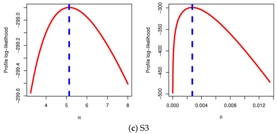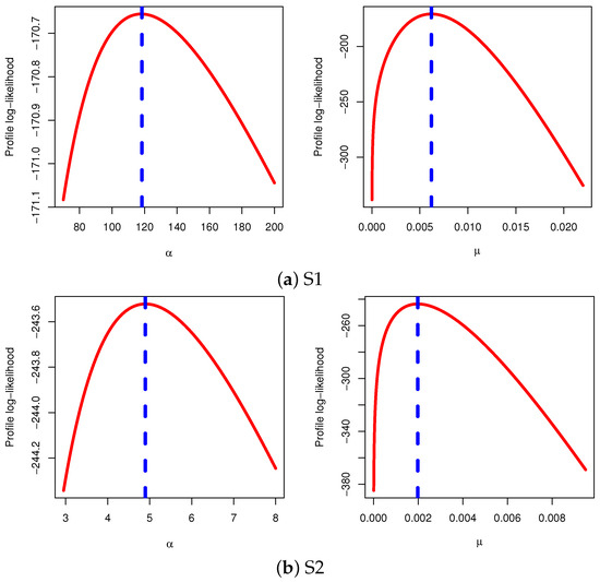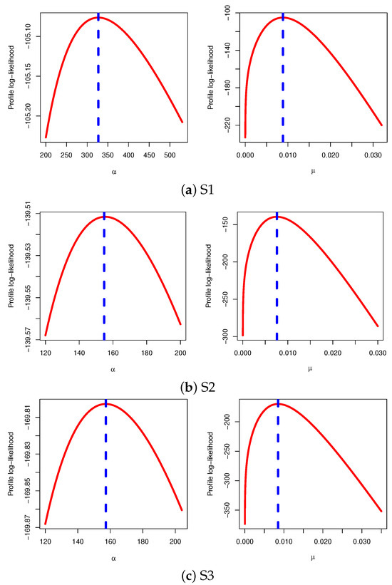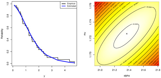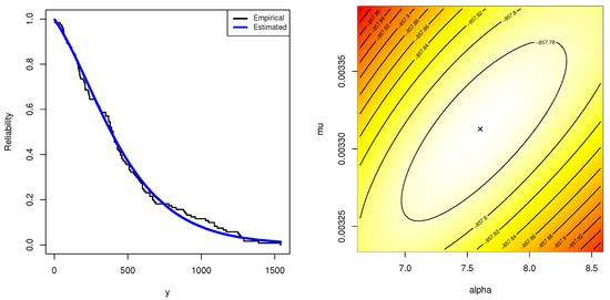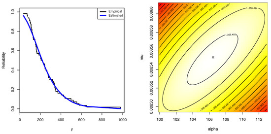 The maximum likelihood estimators (MLEs) of and of and , respectively, are obviously not straightforward in the delivered system of equations. The Newton–Raphson algorithm or another optimization algorithm must be used to obtain the required estimates in such scenarios. Another strategy to obtain the MLEs is to maximize the objective function in (8) with respect to and . This technique is widespread when operating in the R programming language.