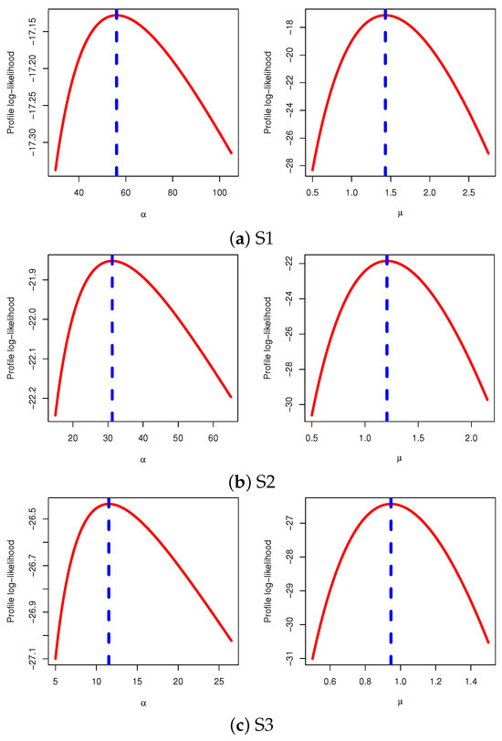 To show the existence and uniqueness of the offered MLEs of and , Figure 8 depicts the profile log-likelihood functions of and for each simulated sample given in Table 2. It proves, based on all breast cancer samples, that the proposed MLEs of the two unknown parameters may exist and are unique.
