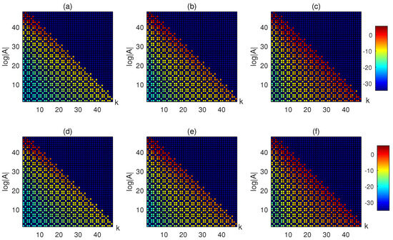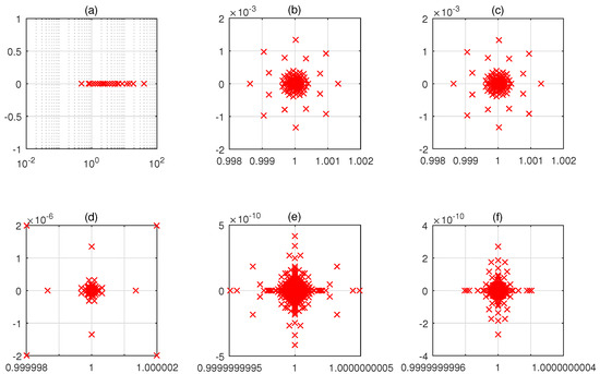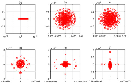 Spectral distribution of the coefficient matrices, where (a) is of with , , in Example 2, and (b–f) is of with , respectively.