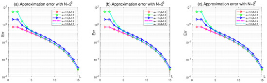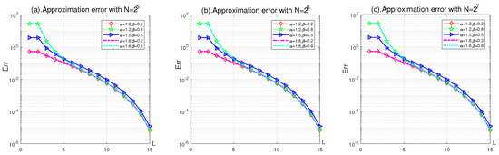 Theorem 1 gives a clear indication that will approximate to better and better as L gets larger and larger, and will be equal to if L is equal to M. In the following Figure 5 and Figure 6, we will take and depict the approximation error of to numerically.
