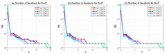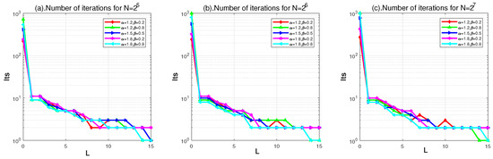 In order to investigate the effect of on PGMRES, we depict the number of iterations such that with variant L for different , and N in the following Figure 9.