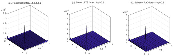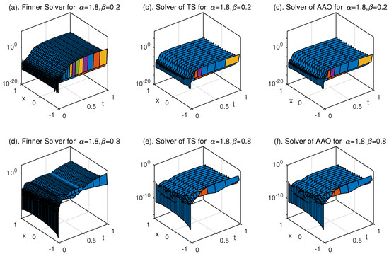 In order to explore the reliability for the numerical solution obtained from the Galerkin–Legendre spectral all-at-once system, we compare the numerical solutions for Equation (9) with different methods in the following. We note that since the analytical solution in Equation (9) is difficult to obtain, here we also use the numerical solution under refined grid as the exact solution. Solutions for Equation (9) calculated by TS and AAO(L) are present in the following Figure 12.