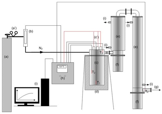Block diagram of the experimental fixed-bed pyrolysis reactor: (a) cylinder with nitrogen gas; (b) gas mass flow meter; (c) the pyrolysis reactor vessel; (d) thermal insulation; (e) steam condensation system; (f) separation system-vessels for receiving condensate; (g) discharge of non-condensable gases in the gas washing system; (h) control box; (i) PC; (a′) reducing valve; (c′) electric heater connection wiring.