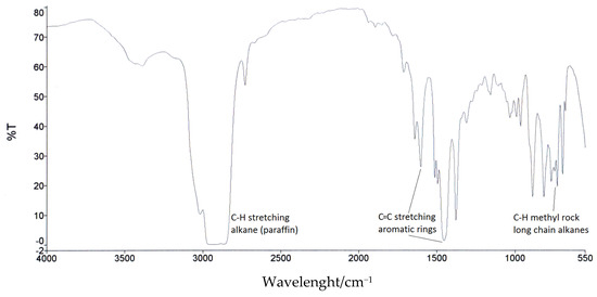 The determination of the composition of pyrolytic oil, i.e., the distribution of carbon atoms in the paraffin chains, aromatic and naphthenic rings, was carried out using the CEI IEC 590 method. In general, this method is based on the relationship between measured absorbance at 1610 cm−1, 720 cm−1, and n-d-M analysis (ASTM D3238 [86]), which allows the determination of the fraction of carbon atoms in aromatic ring structures. Figure 2 shows the IR spectra of pyrolysis oil obtained under the selected optimal pyrolysis conditions (120 min reaction time, 450 °C and 100 mL/min inert gas). On the IR spectra, the characteristic absorption peaks at the wave numbers 1610 cm−1 and 720 cm−1 were identified and measured. This was used to determine the fraction of carbon content in aromatic rings-CA (corresponding to the peak at 1610 cm−1), the fraction of carbon content in paraffin chains-CP (corresponding to the peak at 720 cm−1) and the rest of the carbon contained in naphthenic rings-CN as a sum up to 100: