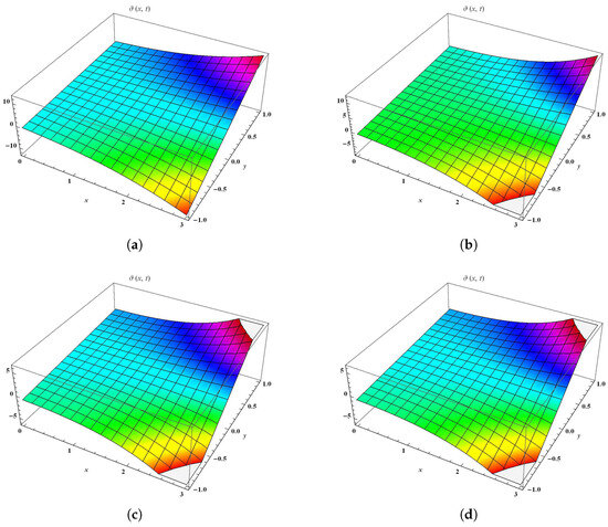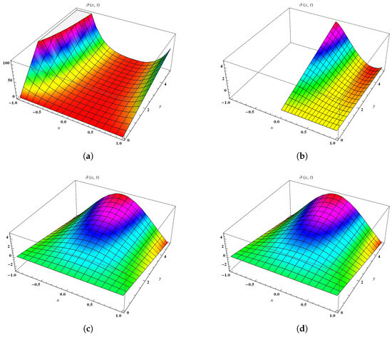 Similarly, Figure 2 has been divided into four sections at different fractional orders and considers the values and . Figure 2a,b shows the solution of the T-RPSM at fractional orders and , respectively. Figure 2c shows the solution of the T-RPSM at fractional order 2, whereas Figure 2d represents the graphical results of the exact solution. We observed that the graphical results of the T-RPSM and the exact solution strongly agreed with each other. Table 2 shows the absolute error between the T-RPSM and the exact solution at . The results obtained by th T-RPSM at fractional order were in full agreement with the exact solution. We note that the absolute error decreased with a decrease in the values of and .