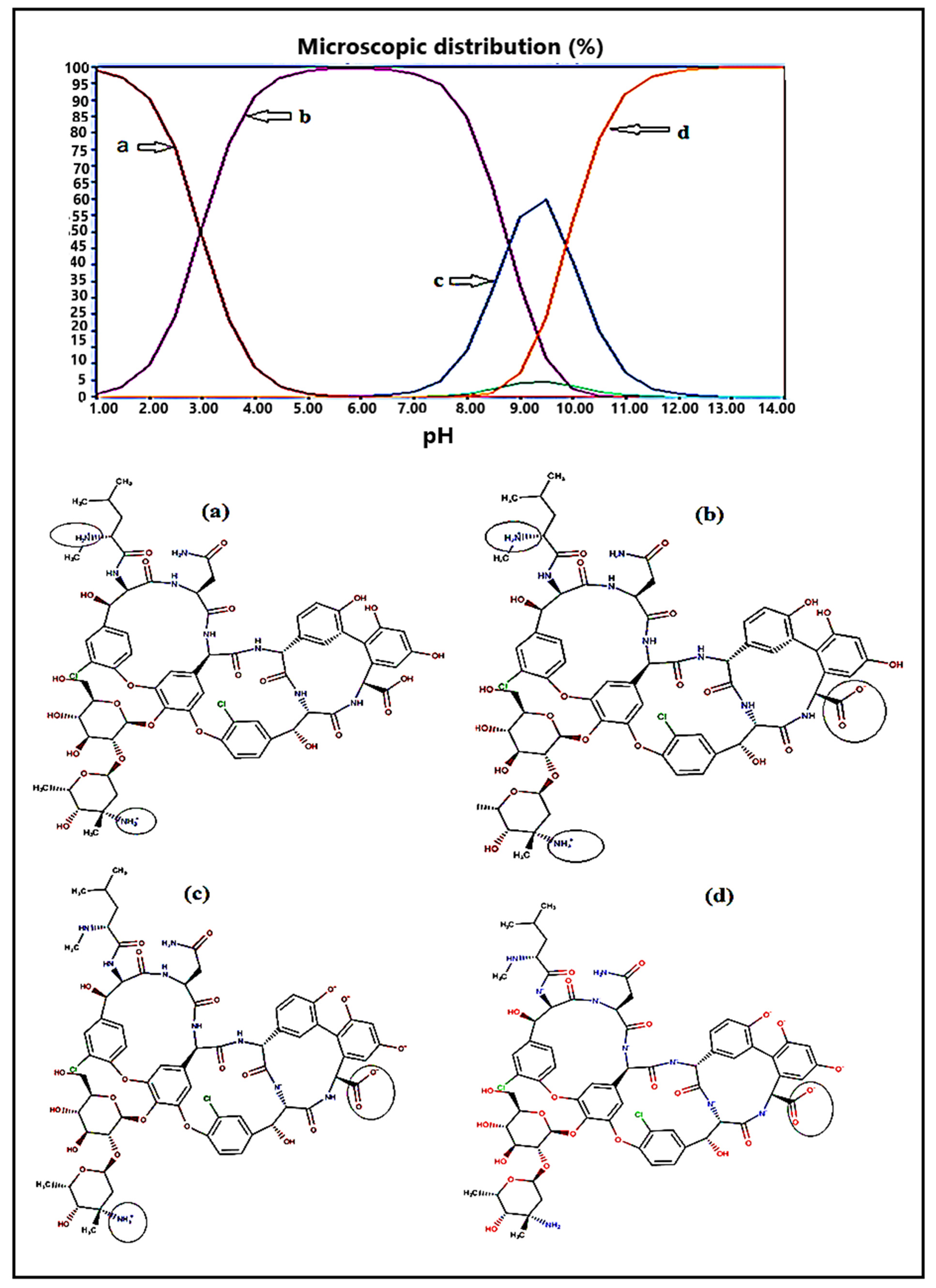 - Takács-Novák, K.; Noszál, B.; Tókés-Kövesdi, M.; Szász, G. Acid-Base Properties and Proton-Speciation of Vancomycin. Int. J. Pharm. 1993, 89, 261–263. [Google Scholar] [CrossRef]