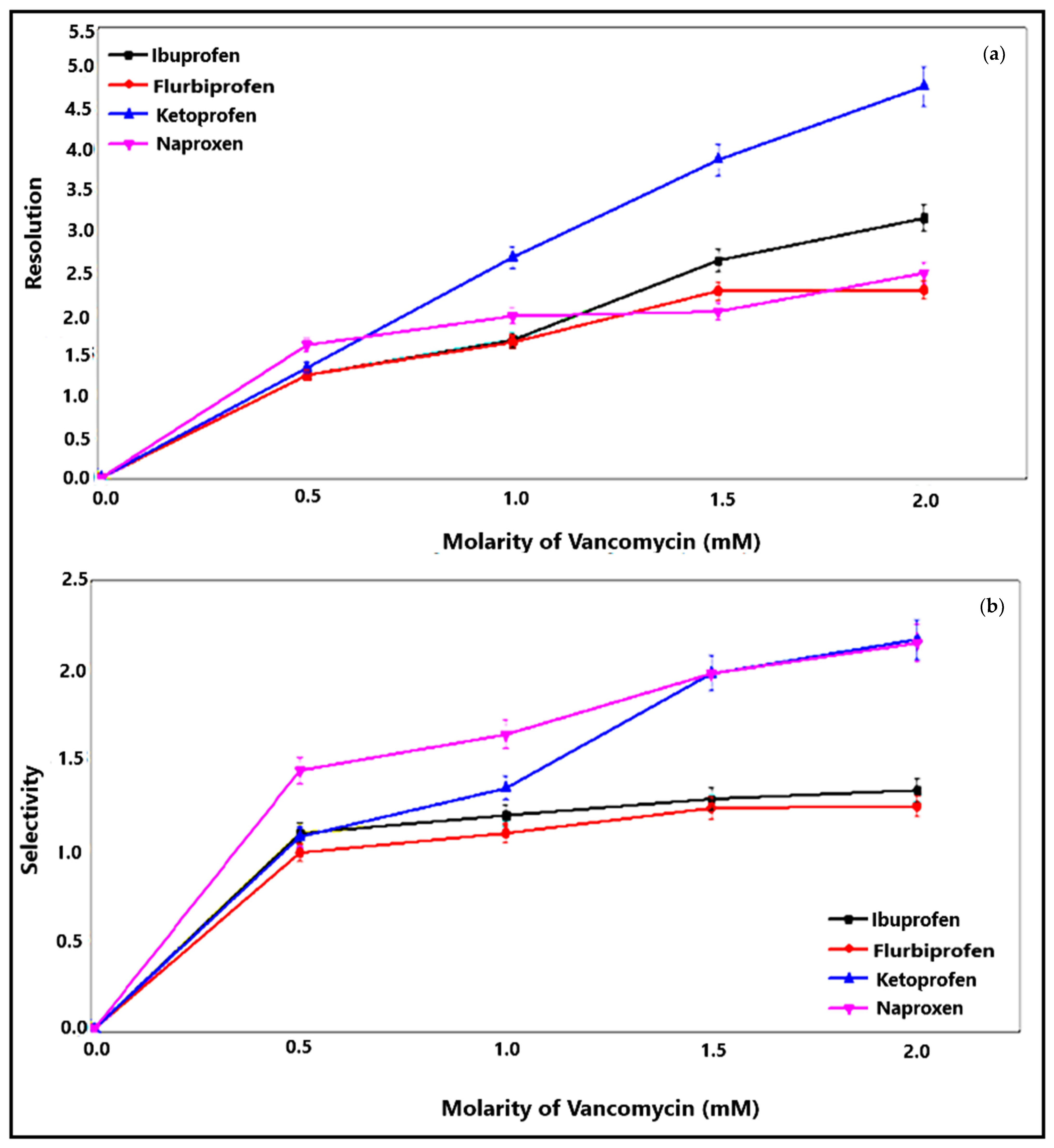 | Profen Drugs | Molarity of Vancomycin (mM) | Retention Time (min) |