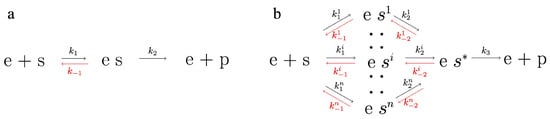 In the case of and , the kinetic mechanism in Figure 1a can be extended to the mechanism of Figure 1b, with n enzyme-substrate complexes () and kinetic constants independent of i. In this case, assuming and steady-state conditions for the enzyme intermediaries, (Equation (A1)) is calculated as follows: