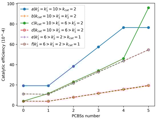 Numerical simulation was used to obtain the product concentration of generic enzyme-catalyzed reactions with and without PCBSs. The values of , and the catalytic efficiency were obtained under different values of kinetic constants. As shown in Table 1, Table 2 and Table 3, under the tested conditions, decreases rapidly to a minimum value with an increasing number of PCBSs. For , the same trend is observed but with a sharper decrease with respect to . Since the catalytic efficiency is the ratio between and , this parameter is a determinant of substrate selectivity and for comparing enzymes. Our results indicate that this parameter increases with the number of PCBSs for all of the systems studied (Figure 2). As observed in the conditions studied, the values of generate a greater increase in catalytic efficiency. If (b, c and d), the greatest increase in efficiency is obtained with (c); furthermore, if , the system shows the same behavior (b and d).