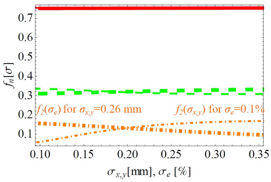 Consider LEUTL FEL; radiation of λ1 = 532 nm is generated by electrons with energy of E = 217 MeV. The electron beam section σx,y~0.25 mm, emittance γεx,y = 6.2 π mm × mrad, energy spread σe = 0.1%, current I0 = 210A, and other data of the experiment were reported in [31,32]. Detailed analysis of LEUTL FEL radiation can be found in earlier publications [47,48,49,50,51,52]. Very good agreement of our theoretical description of LEUTL harmonic powers and the experimental data was observed when we calculated the effective angle of electron–photon interactions and accounted for ≈ 0.14 in [48,49,50,51,52]. If only emittance and divergence θdivγ ≈ 0.07 are considered, then the theoretical powers of even harmonics appear much lower than those measured and reported in [31,32] (see the difference in [50,51]). For LEUTL, the measured average content of the second FEL harmonic was P2/P1 = 1/230. Despite the wide beam in LEUTL FEL, the betatron contributions fβeven,p even to the even harmonic Bessel coefficients are comparable with the contributions of the angular divergence in y-plane, for example, for the second harmonic fβn=2,p ~ fn=2,y ≈ 0.02. The effective angle of the electron–photon interaction yields a major term for second harmonic generation; the Bessel coefficients for the second harmonic are the largest in the plane, normal for the undulator field, where we get fn=2,x ≈ 0.14 >> fn=2,y ~ fβn=2,p ≈ 0.02. Total values of the Bessel coefficients for LEUTL FEL in its default setup are the following: = {0.75, 0.18, 0.30, 0.18}; these values can be identified in Figure 1 for the default beam section σx,y= 0.26 mm and beam energy spread σe = 1 × 10−3. For the considered experiment at LEUTL with the electron current I = 210 A, we have obtained analytically the dependence of the Bessel coefficients fn for the harmonics n = 1, 2, 3 on energy spread σe. and on beam section σx,y; is plotted by thick lines and is plotted by thin lines in Figure 1.