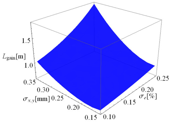 It should be underlined that fixed emittance means that a change in the beam section is compensated by a reciprocal change in the divergence angles, whose influence is non-indifferent since it can contribute to angular effects together with the electron–photon interaction angle in an FEL, and reduce odd harmonics and give additional power to even FEL harmonics. A change in the beam section causes a respective change in the electron current density, which directly affects the bunching and the FEL gain. Interestingly, variation of the energy spread had a significant effect on FEL gain when the beam section was large, while for a narrow beam, the increase in the energy spread of 2.5 times over its default experimental value did not cause a significant extension of FEL gain length (see Figure 2).