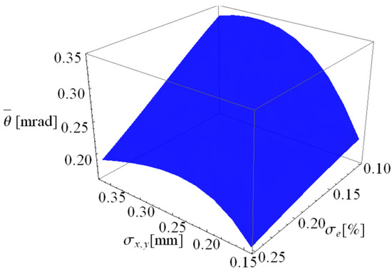 They involve the Twiss parameters βx,y and emittances εx,y. In a well-matched beam, we get , and for most X-ray FELs, ζ ≈ 1. The effect of ζ in this case is minor, and rather than the emittance, the section of the beam affects the FEL performance through the electron current density and angular terms. Note that formula (11) describes the saturated FEL harmonic powers in their nonlinear growth induced by the fundamental, and thus, it involves the Pierce parameter for the fundamental tone ρ1 and not the Pierce parameter ρn for the harmonics n > 1. The results of such a phenomenological account for the main FEL parameters agree with the data for major operating FELs in the range from visible to X-rays, and also with the results of an accurate formula by M.Xie [79,80], where seventeen independent parameters correct the gain length accordingly (see [45,81,82,83] for details). The finite beam section is accounted for in the Bessel coefficients, and it is also important in the calculation of electron beam current density. For FEL radiation, we account for the effective angle of electron–photon interaction, , which is usually the largest angular contribution as compared with the divergence; usually, it exceeds the beam deflection off the axis too. FEL gain senses losses and extends, for example, for the increased energy spread; then, the angle changes accordingly for the increased energy spread, and in turn, the harmonic powers change. The exact behaviors of the Bessel coefficients and FEL parameters for the variation of energy spread and emittance will be shown in what follows.