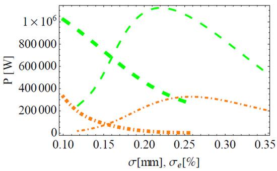 Saturated harmonic powers for the beam energy spread for the default experimental section σx,y ≈ 0.26 mm at LEUTL FEL; E = 217 MeV, λ1 = 532 nm, I0 = 210 A, γεx,y = 6.2 π mm × mrad. The harmonics: P1—solid red, P2—dash-dotted orange, P3—dashed green lines.