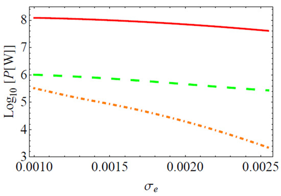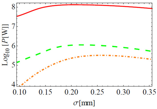 Expectedly, FEL power decreases with an increase in the energy spread. The strongest decrease experiences the second FEL harmonic (see orange dash-dotted line in Figure 6). The reasons for that are similar to those discussed with regard to the behaviors of the Bessel coefficients in Figure 1. The saturated harmonic power (11), induced by the fundamental in the nonlinear generation, depends on the coupling of electrons with the fundamental at its wavelength, and thus, the Pierce parameter ρ1 matters and not ρ2,3. However, the saturated harmonic power is also determined by the Bessel coefficients fn and the losses for the harmonic n. The second FEL harmonic radiation is mainly due to the angular effects of the beam; the effective angle of electron–photon interactions is the largest angular contribution and it decreases (see Figure 3) if the energy spread increases, causing an increase in the gain (see Figure 2). The Bessel coefficient f2 also decreases with an increase in energy spread (see Figure 1), while f1,3 remain almost constant and do not sense the energy spread. This explains the high sensitivity of the second harmonic to losses, energy spread in particular.
