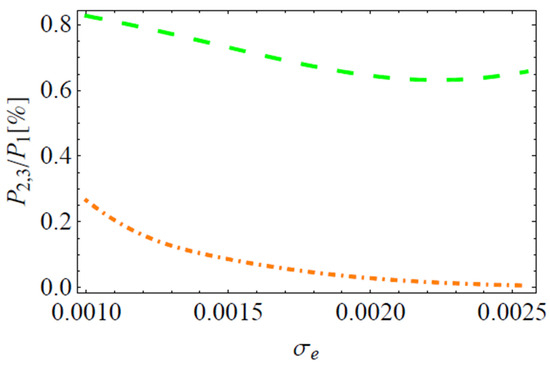 Harmonic content for the energy spread variation for σx,y = 0.26 mm at LEUTL FEL; E = 217 MeV, λ1 = 532 nm, I0 = 210 A. The harmonic content: P2/P1—dash-dotted orange, P3/P1—dashed green lines.