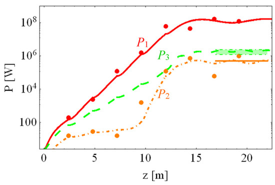 In Figure 8, we also show the experimentally measured values in the LEUTL experiment measured in August 2001 (see [31]), which is well described by our theoretical results (see Figure 8) along LEUTL undulators. The horizontal orange line after 17 m shows the average of the second harmonic power P2 ≈ P1/240 for experiments reported in [31]. Dots show the measurements of the fundamental and second harmonic in the specific experiment, and the green area shows the range of the third harmonic power in saturation.