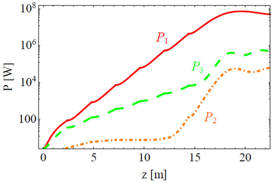 Evolution of the harmonic powers along LEUTL undulators for increased energy spread σe = 2 × 10−3; E = 217 MeV, λ1 = 532 nm, I0 = 210 A, σx,y = 0.26 mm, γεx,y = 6.2 π mm × mrad; the harmonics powers: P1—solid red, P2—dash-dotted orange, P3—dashed green lines.