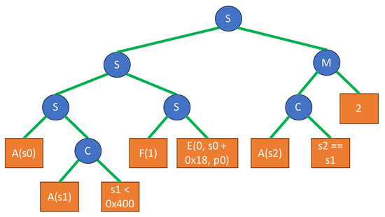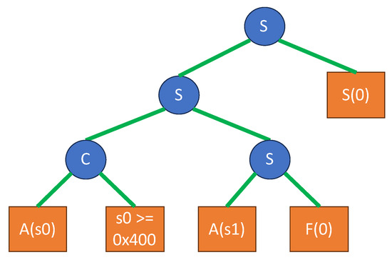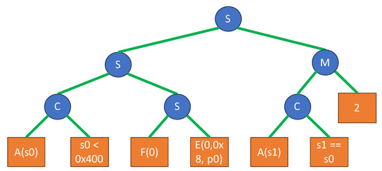 - Exploit generator. The exploit generator will automatically search for an AST path that can successfully exploit the vulnerabilities found by the vulnerability analyzer. The ASTs are constructed based on experts’ experience. The exploit generator collects protection mechanism information, generates the final exploit based on the abstract syntax tree, and verifies that the condition can be satisfied by the SMT solver.