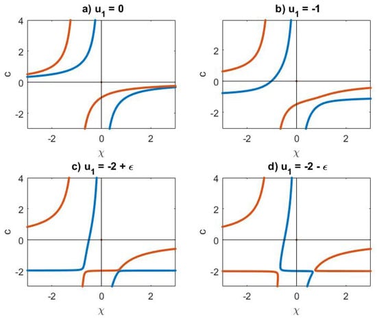 The branches of evanescent and wavy modes for different values of the vertical shear in the WB flow: BC (red) and BEQT (blue) modes according to (23) (a); the effects of the vertical shear on the branches originating from BC and BT modes (b); the reconnection of branches near the marginal stability (c); and weakly unstable flow (d).