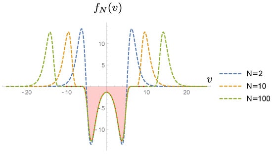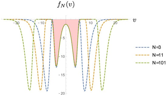 with . The function depends on the parameters and t. For finite N, the function is different for even and odd values of N. The plot of for several even values of N is given in Figure 2. The shaded area is the contribution in the continuum limit. There are additional contributions from the upper plane at finite values of N. As N increases, these contributions are pushed towards infinity, as is shown in the figure.