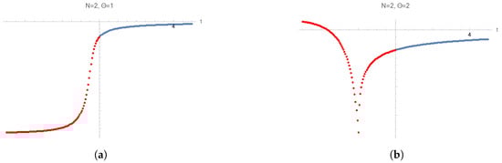 Deformed spectrum for with different values of . The horizontal axis is the deformation parameter t, while the vertical axis is the deformed ground-state energy . The blue and red dots denote the values for positive and negative values of t, respectively. (a) Deformed energy with , . (b) Deformed energy with , .