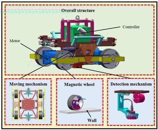 Based on the structural characteristics of petrochemical storage tanks and inspection process analysis, the overall structure of the designed wall-climbing robot for petrochemical storage tank wall inspection is shown in Figure 1. The robot mainly consists of a surface adaptive motion mechanism, a magnetic adsorption wheel, and a detection mechanism. The two wheels on each side are connected by a drive belt, and two motors are employed, with each driving a single wheel on one side, thus constituting a motor-driven active wheel, while the other wheel is driven by belt drive in order to obtain the same speed and directional motion. The wheels on both sides run separately without interfering with each other, and the motors are arranged symmetrically at the head and tail ends. The overall structure is completely symmetrical, and the differential speed rotation of the wheels on both sides is used to perform vehicle steering. A high-performance magnetic wheel structure with fast demagnetization is also proposed, making it possible to adapt to surfaces with different curvatures by means of coordinating a movement mechanism with multiple degrees of freedom, thus ensuring that the robot has strong adsorption force and is able to quickly perform the demagnetization process, so that the robot can be safely detached from the wall. According to the operation requirements of different inspection modules, a flexible inspection mechanism is designed to combine the pull rope and hook hinge mechanism in order to achieve adaptive vertical alignment of the probe, thus making it adaptable for carrying out different inspection techniques. The inspection robot is able to perform precise movements and the action required for different inspection processes by means of a state control strategy, enabling it to ultimately perform wall inspection tasks.