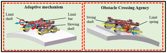 In order to improve the stability of the robot when working at different curvature elevations, while at the same time expanding the fitting area of the robot and the circular steel plate, a surface adaptive floating mechanism was designed. The floating mechanism is mainly comprised of a floating rotary axis, a limiting rod, and a limiting axis. The wheels on the left and right sides are connected by the floating rotary axis to ensure that the wheel carriers on both sides are able to rotate around the axis. When encountering surfaces with different curvatures, the rotation of the floating rotary axis and the micro movement of the limit rod drive the wheel carriers to adapt to the curvature of the surface, so that each wheel adsorbs closely to the wall surface, and the complete fitting movement of the car on the surface can be realized, such that the robot can be safely adsorbed onto walls with different curvatures. The robot uses the adjustability of the cam mechanism to realize the over-the-wall motion, and the cam is pushed to rotate around the swing-back axis by the deformation of the limit buffer spring behind the cam, which is used to prevent the risk of the robot losing stability and falling due to the lifting of the wheels on one side, and to achieve precise adjustment of the stiffness of the robot’s flexible suspension. The drive motor is arranged diagonally, and the synchronous belt is used to transfer the speed, guarantee the driving torque, and simplify the control, so that the robot can complete its work safely and smoothly.