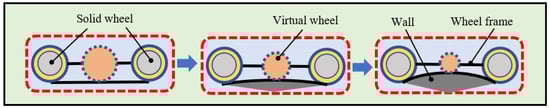 It is assumed that the solid wheel’s linear velocity direction is constantly tangential to the trajectory, whereas the virtual wheel maintains pure rolling contact with the wall, and is subject to no slippage. The active wheel linear speed is , the angular velocity is , the linear speed of the virtual wheel is , the angular velocity is , the linear speed of the driven wheel driven by the main wheel is defined as , and the angular velocity is .