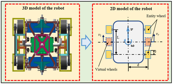 The robot system model is the basis for studying the robot control algorithm, and in order to better realize high-precision trajectory tracking of the robot, in this chapter, the mathematical model of the system is first established, and the real-time differential equation of positional error is solved using kinematic modeling. The robot systematic error model is shown in Figure 8. The robot body is simplified to be composed of two driving wheels and the car body by using virtual wheels, where the left and right wheels are the driving wheels.
