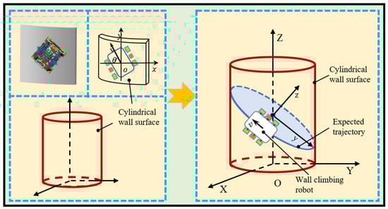 First, a complete global coordinate system is established to describe the coordinates of each wheel of the robot, and then the robot trajectory equation is determined on the basis of the robot’s heading angle, and the virtual wheel radius is calculated from the position of each wheel center in the trajectory equation. This model is built on the premise that there will be no slip and skid under the rigid structure of the robot, and the global coordinate system is established on the basis of the position of the robot and in line with the wall parameters. A schematic diagram of the robot’s position at a heading angle of is shown in Figure 6, where the cylindrical sketch is a simplified model of the robot’s working wall. The coordinates of the robot’s unilateral active wheel in the global coordinate system are defined as ; the coordinates of the driven wheel are ; and the virtual wheel coordinates are . Since the -axis parameter after the coordinate system conversion is independent of the virtual wheel radius, the change in the -axis parameter is ignored for the sake of simplicity of operation. Therefore, for , , , a coordinate system transformation is performed as follows, and the new coordinate system is defined as the trajectory coordinate system :