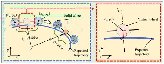 In the same moment , the active wheel is determined on the basis of the trajectory course for , the virtual wheel on the same side can be determined through the distance for , because the curvature of the robot’s elliptical reference trajectory changes from time to time, so that there is a small error in the size of the distance traveled by both, where an error value of is proposed, and the relationship between the sizes of the two distances is as follows: