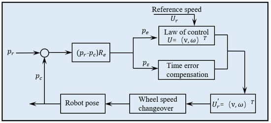 Based on the results of the above equation, it can be concluded that the control law compensates for the robot system for the time feedback error and the overall asymptotic convergence to the equilibrium point can be achieved by automatically tracking the reference trajectory. Figure 9 presents a block diagram of the trajectory tracking process.