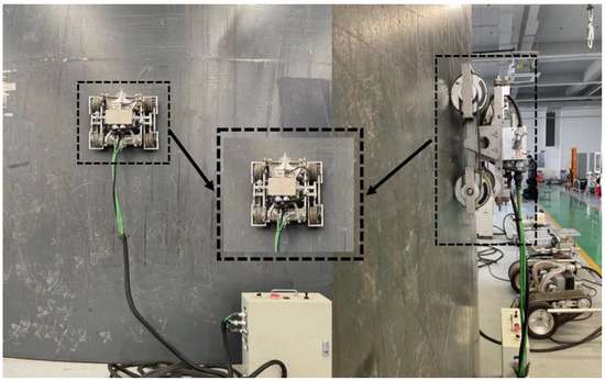 With the growth of the petrochemical sector, the issue of petrochemical storage tank wall maintenance has become a focal point of businesses. At the moment, manual labor technology is still widely utilized both at home and abroad; not only is manual work efficiency low and pricey, but these duties are also notorious for their dangerous and difficult working environments [,,,,]. The creation of a dependable wall-climbing robot has become a hot topic in tank maintenance, given the requirement to move with high precision over curved and uneven walls, which places growing demands on performance. Surface adaptation and high-precision trajectory tracking, for example, are important technologies in the field of wall-climbing robots and key technologies for meeting industry needs [,,,,].