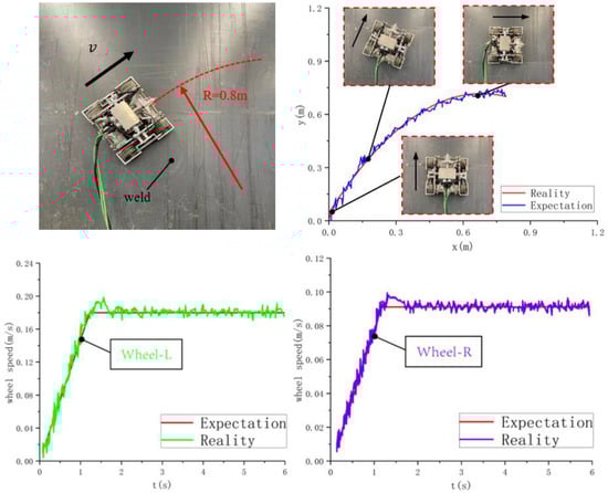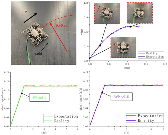The robot did not lose its stability, and completed the right turning movement from the vertical direction to the horizontal direction in the experiment described above. The left and right wheel rotation speeds were set at 0.18 m/s and 0.09 m/s, respectively; therefore, the expected theoretical turning radius was 0.8 m. The experimental data show that the robot was able to move smoothly to the end of the set trajectory during the motion, but the actual speed fluctuated greatly with respect to the expected speed, resulting in obvious deviations between the robot’s travel trajectory and the expected set trajectory, and thus not meeting the requirements of high-precision operation. In order to reduce the offset error of the robot trajectory, an error compensation controller was added, and the above experiment was conducted again. Specific details regarding the experimental procedure and test data are shown in Figure 12.