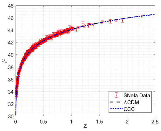 Our focus in this section is to explore how well the Pantheon supernovae type Ia (SNeIa) data [45] fit the CCC model. SNeIa are the best standard candles for measuring cosmological distances, and, thus, this fit is essential for a model to qualify for further studies.
