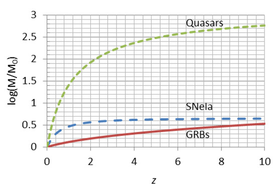 Other factors can also affect the SNeIa luminosity as a standard candle. One such factor is the dependence of SNeIa luminosities on the metallicities of their host galaxies, e.g., [57]. They showed that the SNeIa in high-metallicity hosts are magnitude brighter than those in the low-metallicity hosts. If we consider that the metallicities of the galaxies increase with their age, i.e., they increase with increasing scale factor , and that the calibration of the SNIa standard candle luminosity is performed from observations in galaxies with , we may write the magnitude decrease with as . This corresponds to the magnitude decreasing with increasing redshift as . Equation (48) should, therefore, be modified as follows: