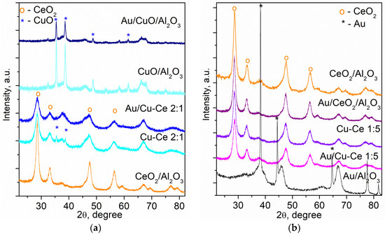 PXRD patterns of the studied samples: (a) with a molar ratio of Cu-Ce 2:1 with and without gold, CuO/Al2O3, Au/CuO/Al2O3, and CeO2/Al2O3; (b) with a molar ratio of Cu-Ce 1:5 with and without gold, CeO2/Al2O3, Au/CeO2/Al2O3, and Au/Al2O3.