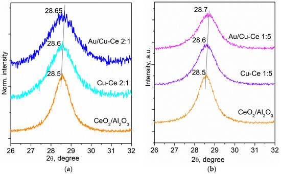 PXRD magnified pattern of CeO2 (111) in 2θ range of 26–32°: (a) samples with a molar ratio of Cu-Ce 2:1 with and without gold; (b) samples with a molar ratio of Cu-Ce 1:5 with and without gold.