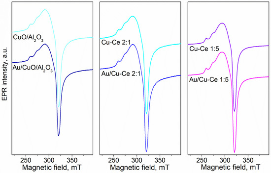 The literature data show that X-ray photoelectron (XP) spectroscopy is often used to investigate the copper oxidation state. However, based on our experience with characterization of CuO/ceria catalysts [50], the analysis of Cu 2p XP spectra of samples with low Cu/Ce ratios such as the present case of a Cu/Ce ratio of 1:5 is complicated because the shake-up satellite signals characteristic for the Cu2+ oxidation state became undetectable. Keeping this in mind, all copper-containing samples were analyzed by EPR spectroscopy, which is a very sensitive and reliable technique to analyze the oxidation state of copper. EPR spectra collected at room temperature have an identical shape typical of Cu2+ ions (Figure 3). Spectral parameters, namely g factors, line widths (H), and peak-to-peak signal amplitudes (I) are presented in Table 2. Signals with these parameters correspond to isolated, monomeric Cu2+ species on the catalyst surface characterized by axial spectra with resolved hyperfine features in the parallel region [51]. Hyperfine features in the perpendicular region are not observed. As can be seen in Table 2, spectral parameter values are similar. An exception is the line width of Cu-Ce 1:5 and Au/Cu-Ce 1:5 samples where the EPR signal is narrower than those of the other samples. This result could be attributed to better dispersion of the Cu2+ ions in Ce-rich composition. Recently, a low intense line at a g value of 1.9677 was observed in the EPR spectrum of the CuO/CeO2 (3 wt.% Cu) sample [50]. The line was assigned to Ce3+ ions formed during the water–gas shift reaction. However, no signal due to cerium ions was registered in the present study, possibly due to a very intense CuO signal.