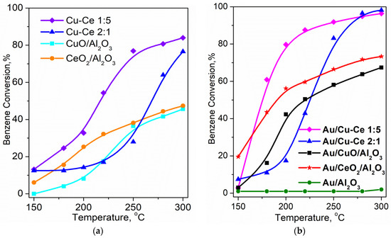 The benzene oxidation activity of alumina-supported single (CuO and CeO2) and Cu-Ce mixed oxides and matching gold-promoted samples as C6H6 conversion degree depending on temperature is illustrated in Figure 5. Any products of incomplete oxidation were not registered in all cases. Comparison of ‘light off’ curves of the catalysts presented in Figure 5a evidenced a strong effect of composition on catalyst activity. CeO2/Al2O3 exhibited better performance than CuO/Al2O3 at temperatures below 250 °C. The same result was reported by Hou et al. [15] and explained by the crucial role of temperature for the catalytic activity of CuO [66]. A significantly higher activity compared to that of single-component counterparts was observed in the whole temperature interval with Cu-Ce 1:5, while Cu-Ce 2:1 exhibited such behavior above 250 °C. A cerium-rich sample showed enhanced performance as compared to the copper-rich one yielding 55% C6H6 conversion at 220 °C vs. 18% with Cu-Ce 2:1 and 77% at 250 °C vs. 28% with Cu-Ce 2:1. Finally, the samples attained 84% and 76% benzene conversion at 300 °C.
