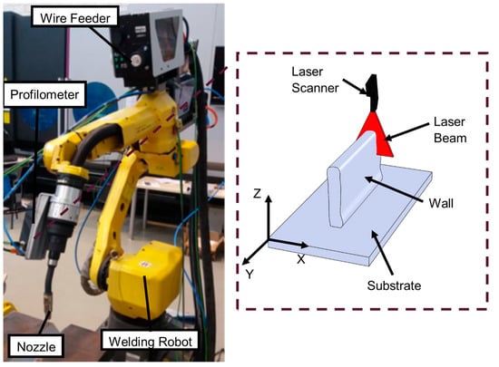 The welding tests were carried out using a robotic-fixed table welding system. The welding equipment used has an Alpha Q 552 pulse current generator (EWM, Mündersbach, Germany), which uses GMAW technology and powers the torch. The torch movement is managed by a special anthropomorphic Fanuc Arc Mate 100-iC reference welding robot (Fanuc, Oshino, Japan). In addition to generation and movement, the torch must be fed with metal wire by means of a wire feed unit from EWM (Mündersbach, Germany) with reference M drive 4 Rob5 XR RE and a shielding gas system. A Queltech Q4-120 profilometer (München, Germany) is also equipped to measure the geometry of the interlayer bead. It is positioned perpendicular to the substrate and its movement is analogous to that of the torch in the weld. Table 2 summarises the characteristics of the laser profilometer for the measurement of the weld layer profile.