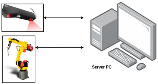 The data measurement chain necessary to implement the methodology described in this paper is shown in Figure 2. The source data had two main sources: the robot control from which the robot position data, execution program, power source generation data, and wire speed data are extracted, and the profilometric laser, which has its own coordinate axis on which the point cloud describing the 2D profile of the welded layer will be extracted. These data are transferred to a server PC in which the communication node makes possible the integration of all the information ensuring the synchronisation of the data. This server PC will be used to run the algorithm and return the corrected and optimised motion execution program. All this was developed using Robot Operating System (ROS) tools. Additionally, the server feeds a database for access to the information once the live cycle is performed and a GUI (Graphical User Interface) in a mobile or tablet application that allows the operator to access profiles and to know points of the trajectory on the acquired profiles.